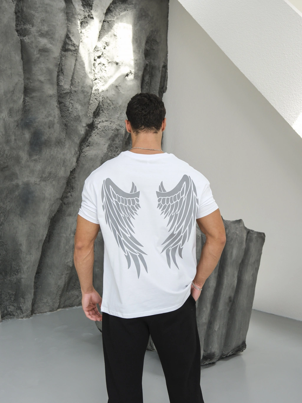 Oversize Beyaz Reflektör Kanat Baskı Kollar Dar Kesim T-Shirt